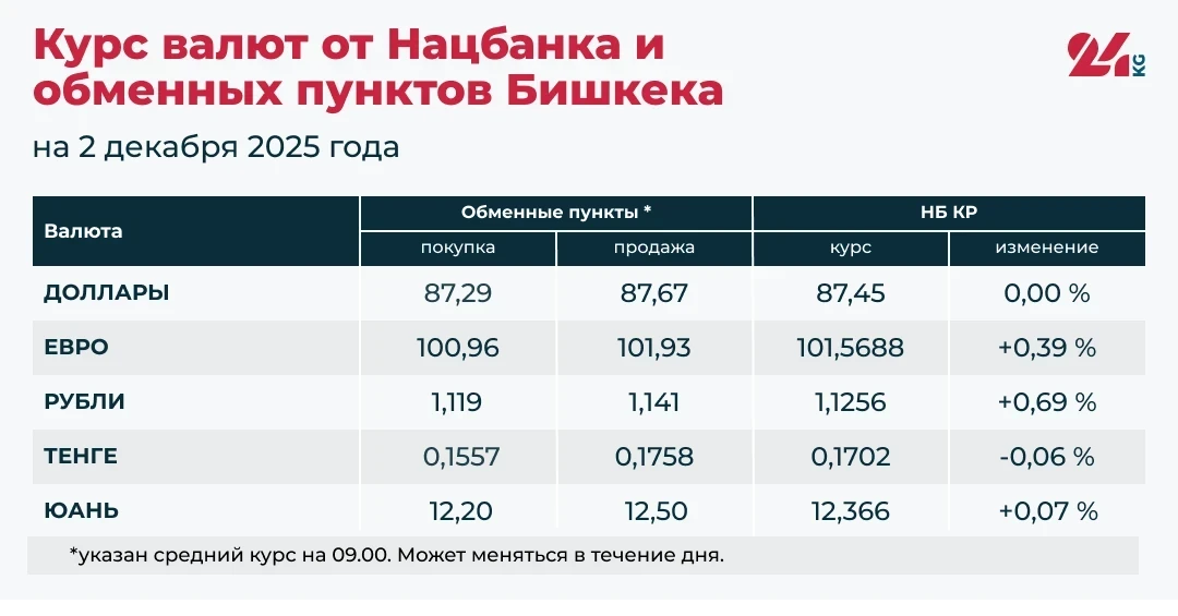 По данным Национального банка Кыргызстана и обменных пунктов Бишкека, наблюдается рост официальных курсов евро, российского рубля и китайского юаня, в то время как казахский тенге немного снизился. Курс доллара остается стабильным.