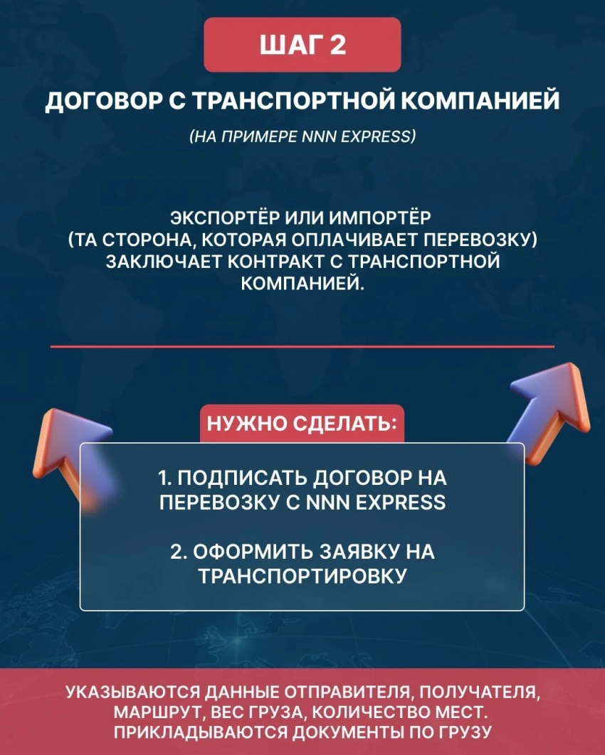 Второй этап включает в себя заключение соглашения с транспортной компанией и подачу заявки на перевозку. В данной заявке указываются данные отправителя и получателя, маршрут, а также вес и объем груза.