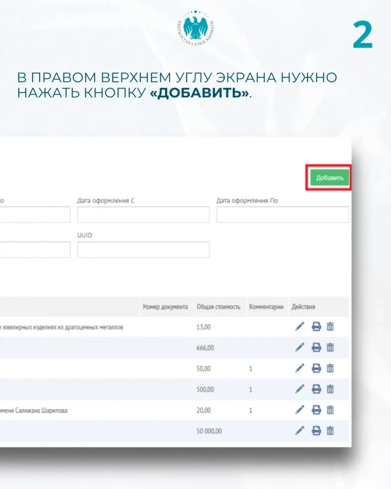 - В правом верхнем углу экрана имеется кнопка "Добавить". В открывшемся окне нужно установить отметку в поле "Внесение сведений о драгоценных ювелирных изделиях из драгоценных металлов".