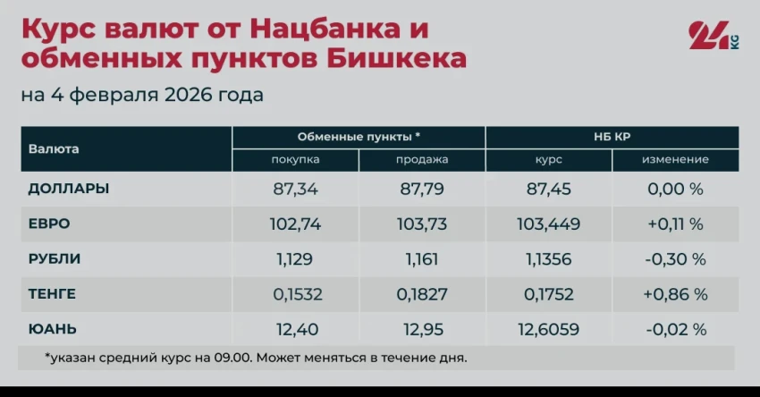 - Средний курс в обменниках: покупка — 87,34 сома, продажа — 87,79 сома.