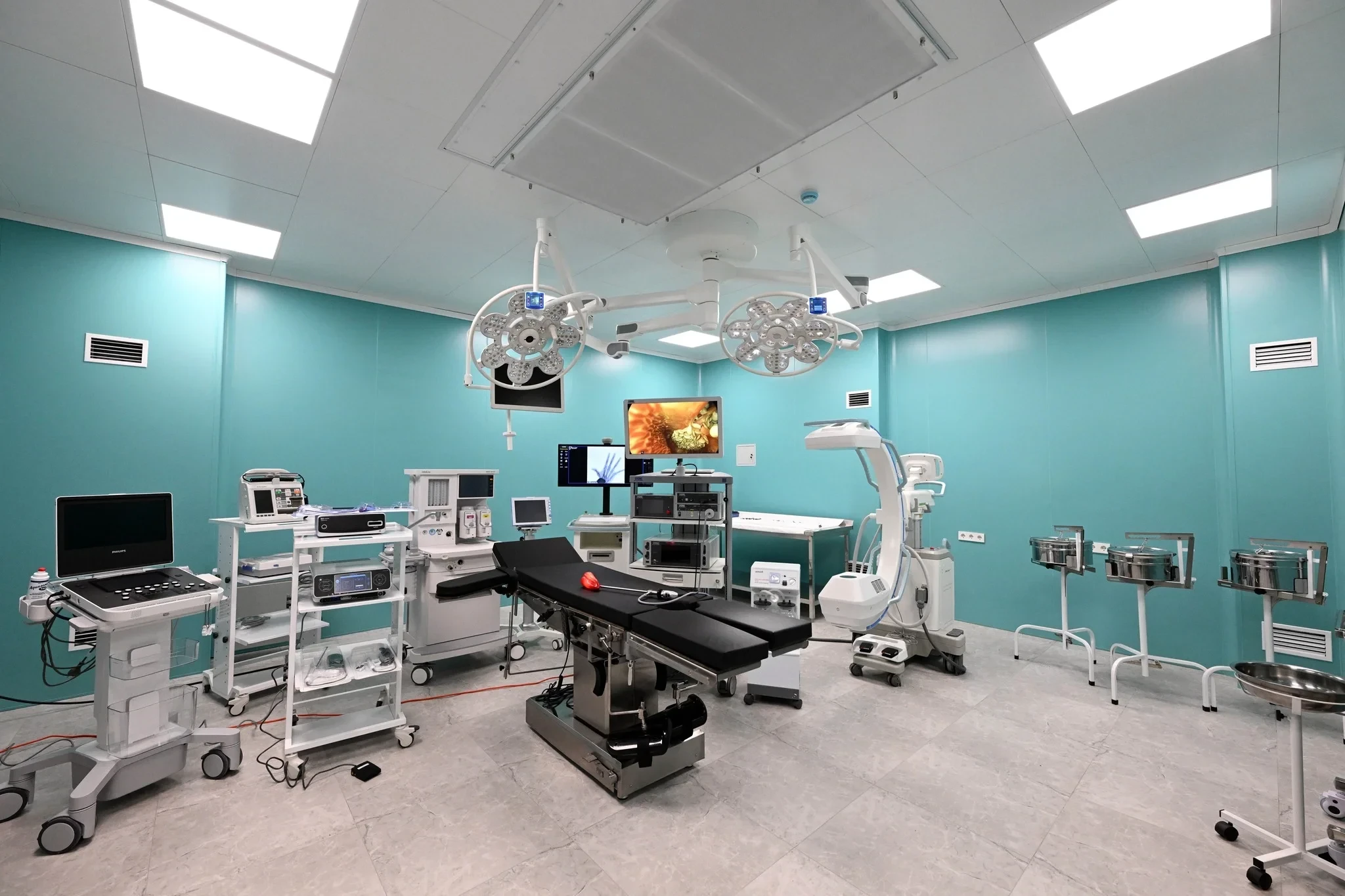 В завершение президент осмотрел кабинеты, оборудованные новейшими технологиями, включая магнитно-резонансные и компьютерные томографы, аппараты для ультразвуковой диагностики и эхокардиографии, а также палаты, конференц-зал, столовую и спортивный зал.