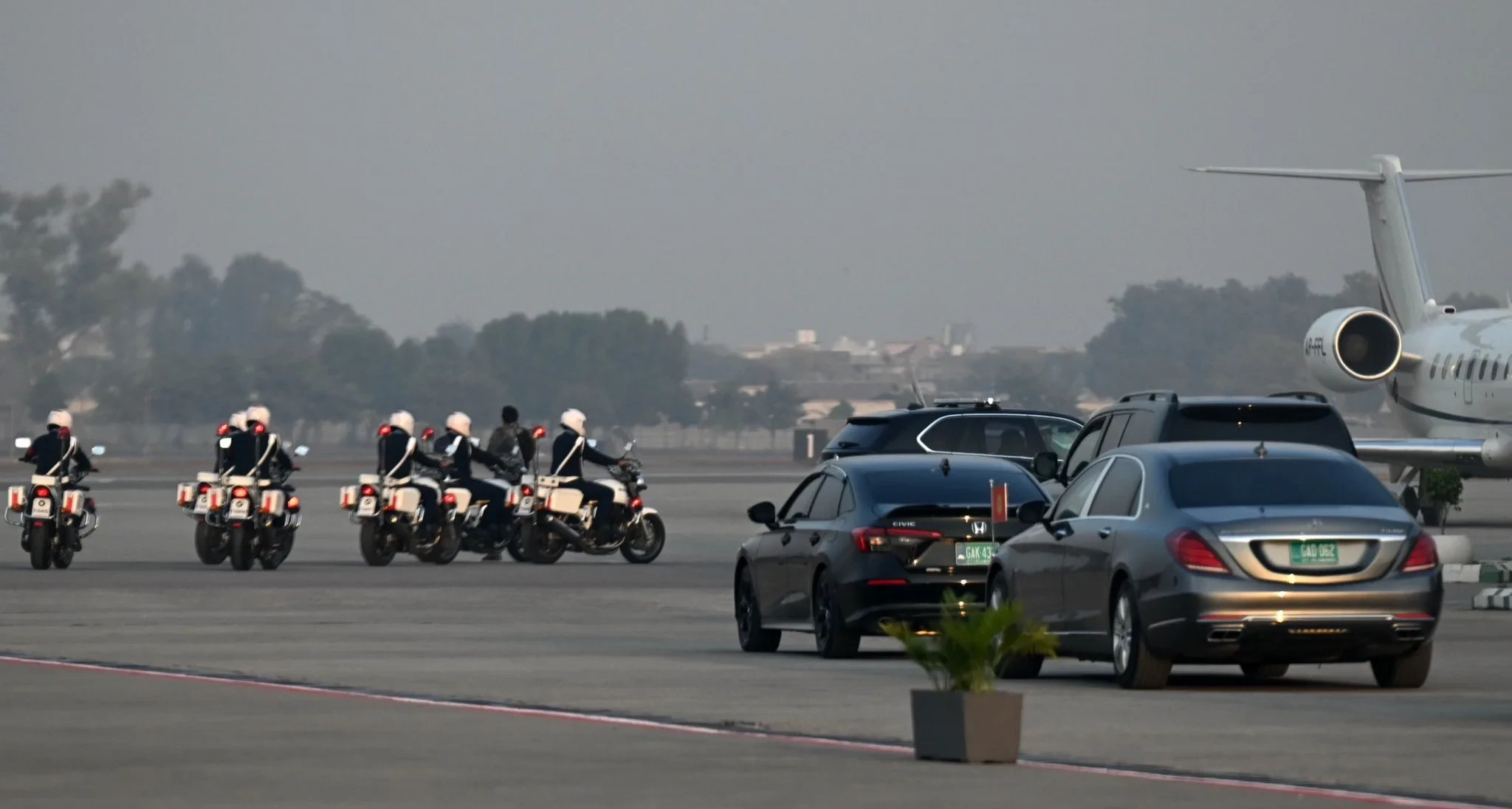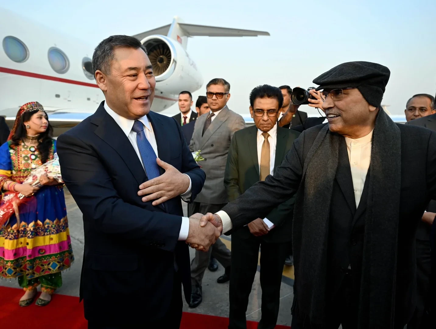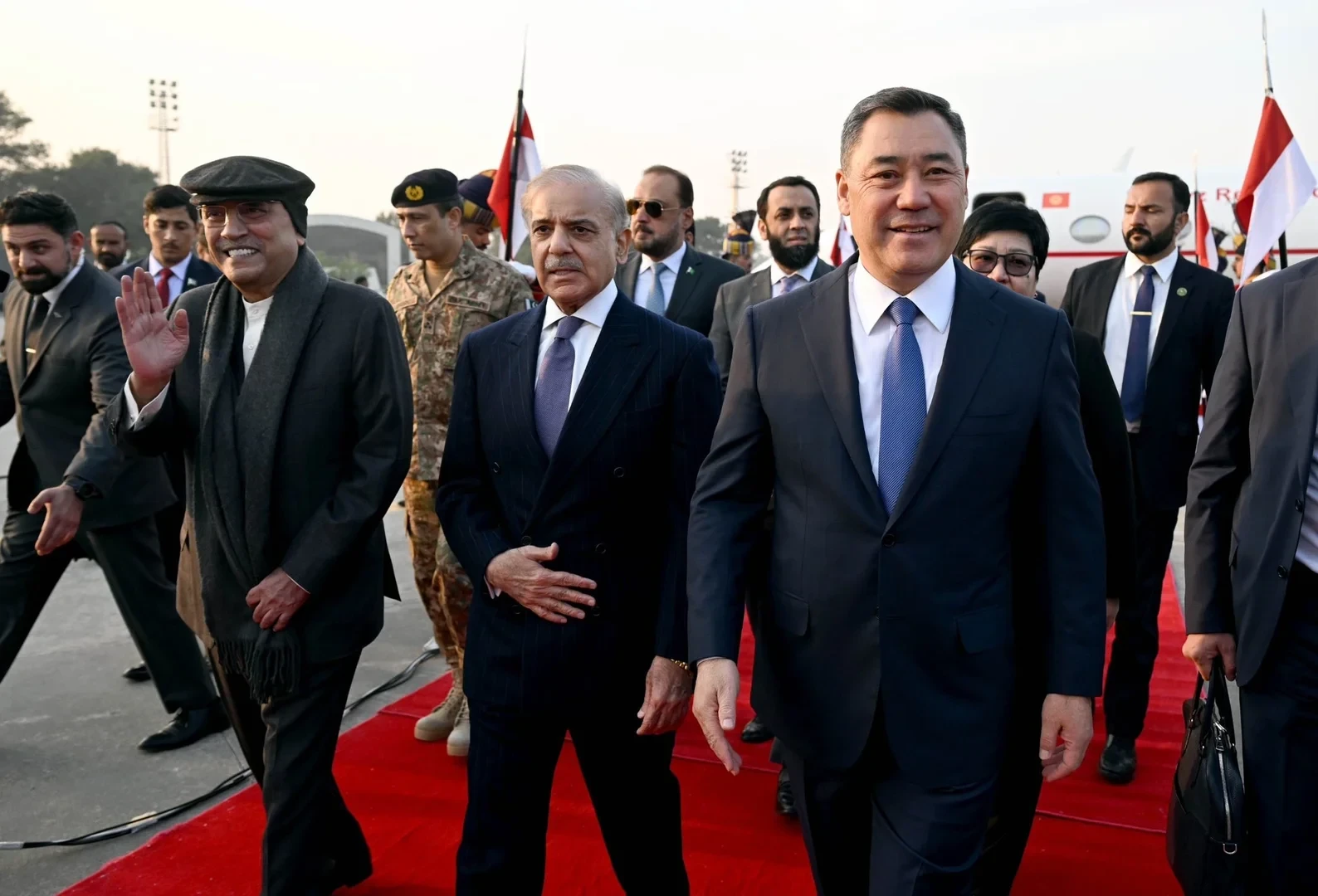 В ходе своего государственного визита в Пакистан, президент Садыр Жапаров был встречен на аэродроме президентом Пакистана Асифом Али Зардари и премьер-министром Шахбазом Шарифом, как сообщил пресс-секретарь президента Аскат Алагозов.