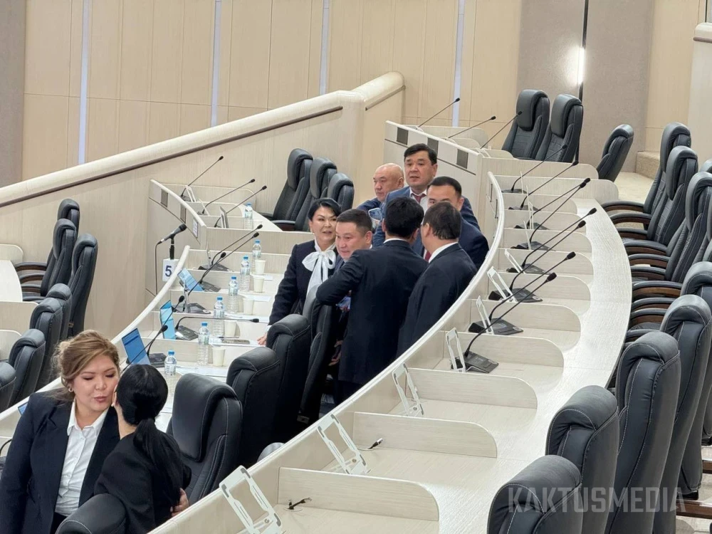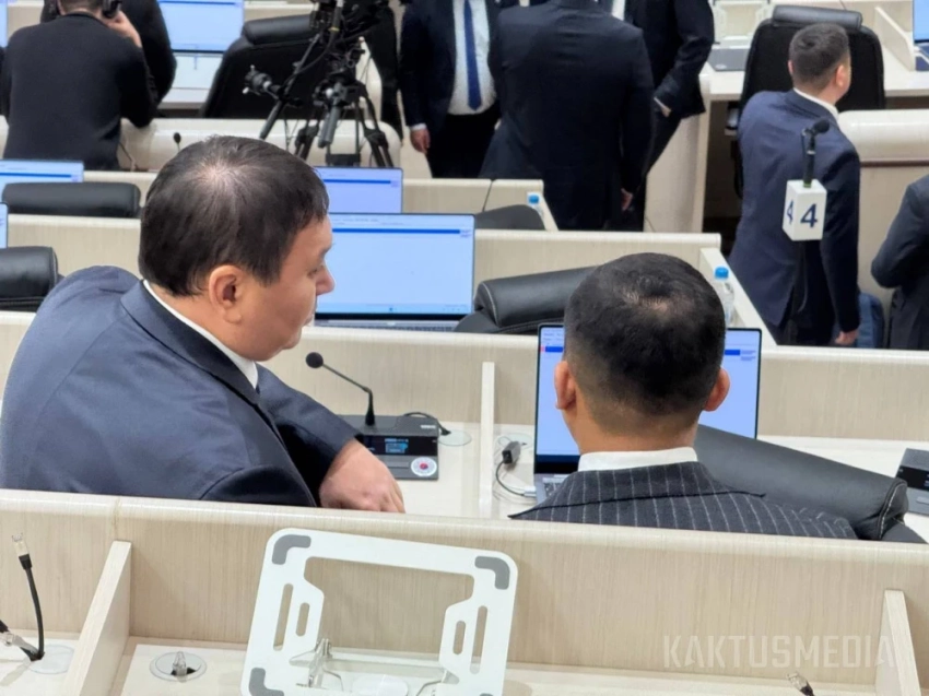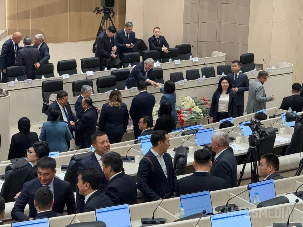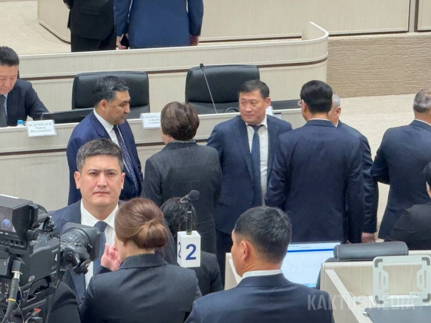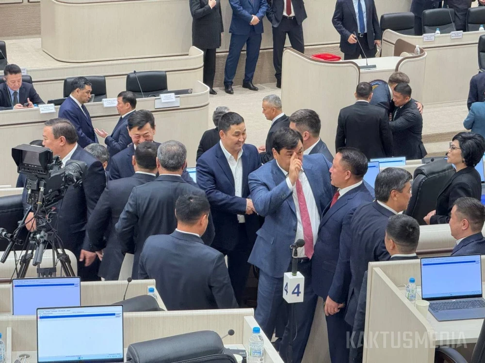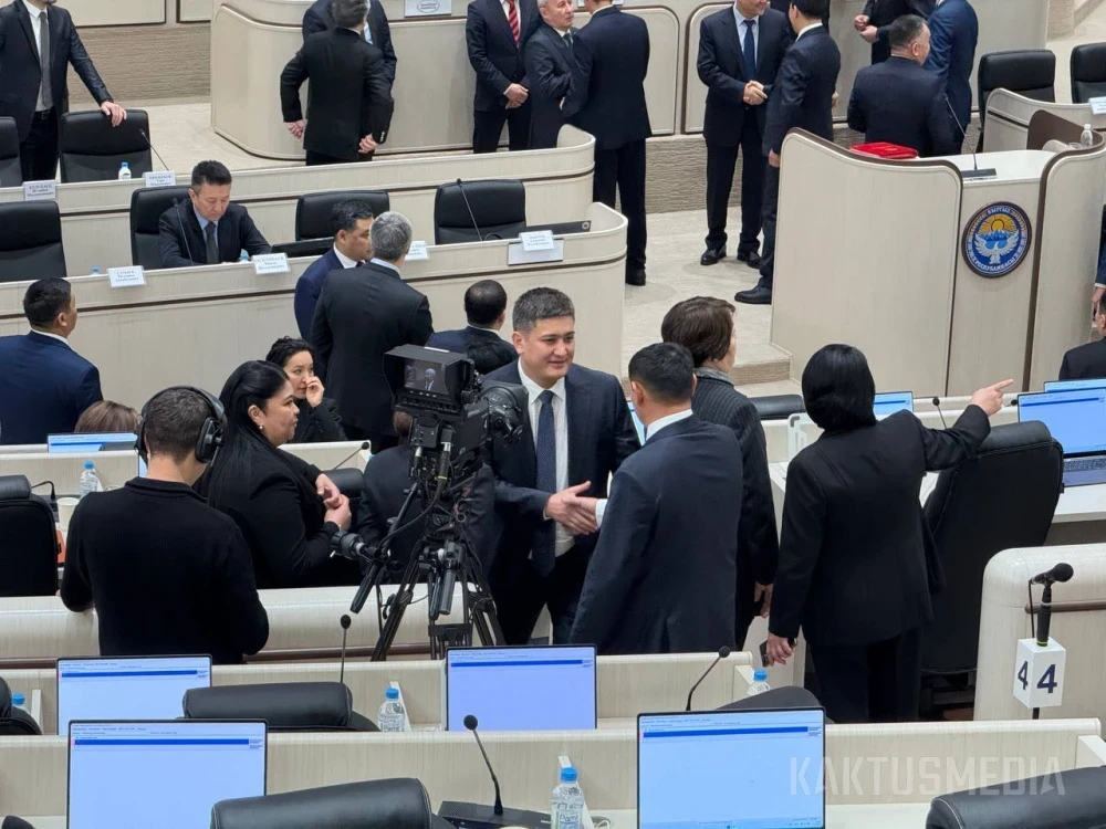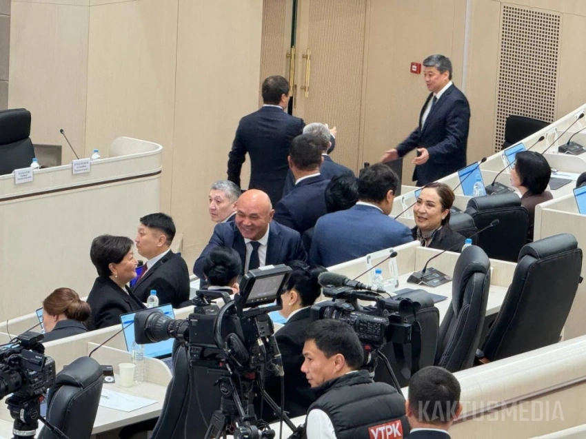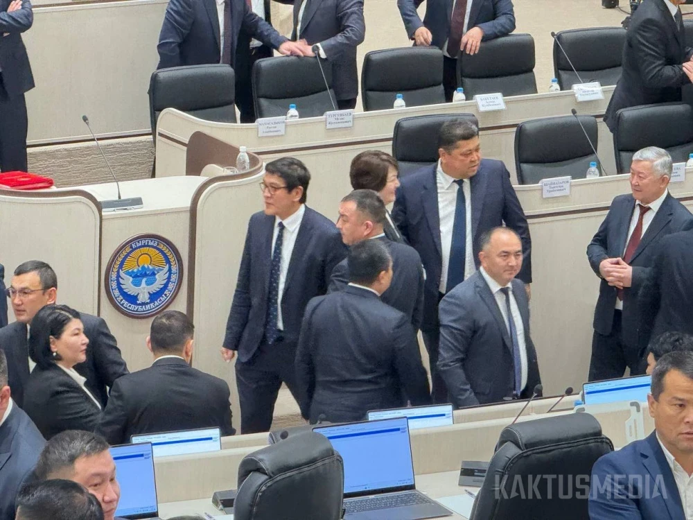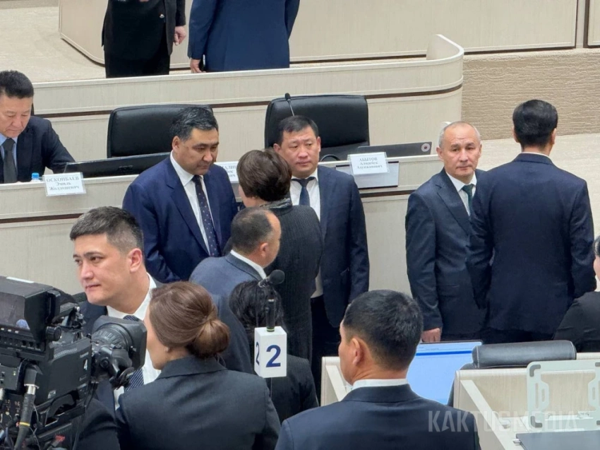 Также в зале заседаний находятся премьер-министр Адылбек Касымалиев, члены правительства и представители Центральной комиссии по выборам и референдумам.