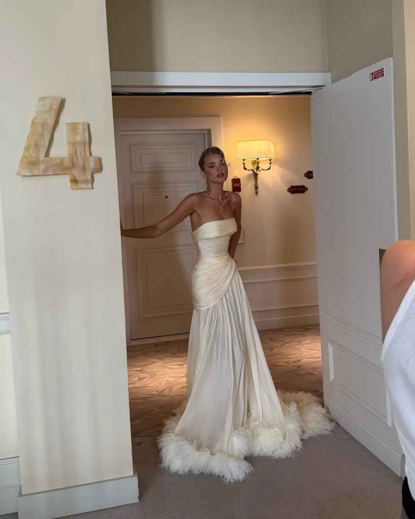 Мастерица перевоплощений Эльза Хоск показала в Каннах два модных образа. Она выгуляла винтажное полупрозрачное платье Mugler, а до этого вышла на дорожку в белоснежном наряде Anastasia Zadorina с перьями на подоле. Ирина Шейк стала звездой фестиваля по количеству образов, но отметим белый брючный костюм из капсульной коллекции Mango, который она надела со сланцами и бриллиантовым колье.