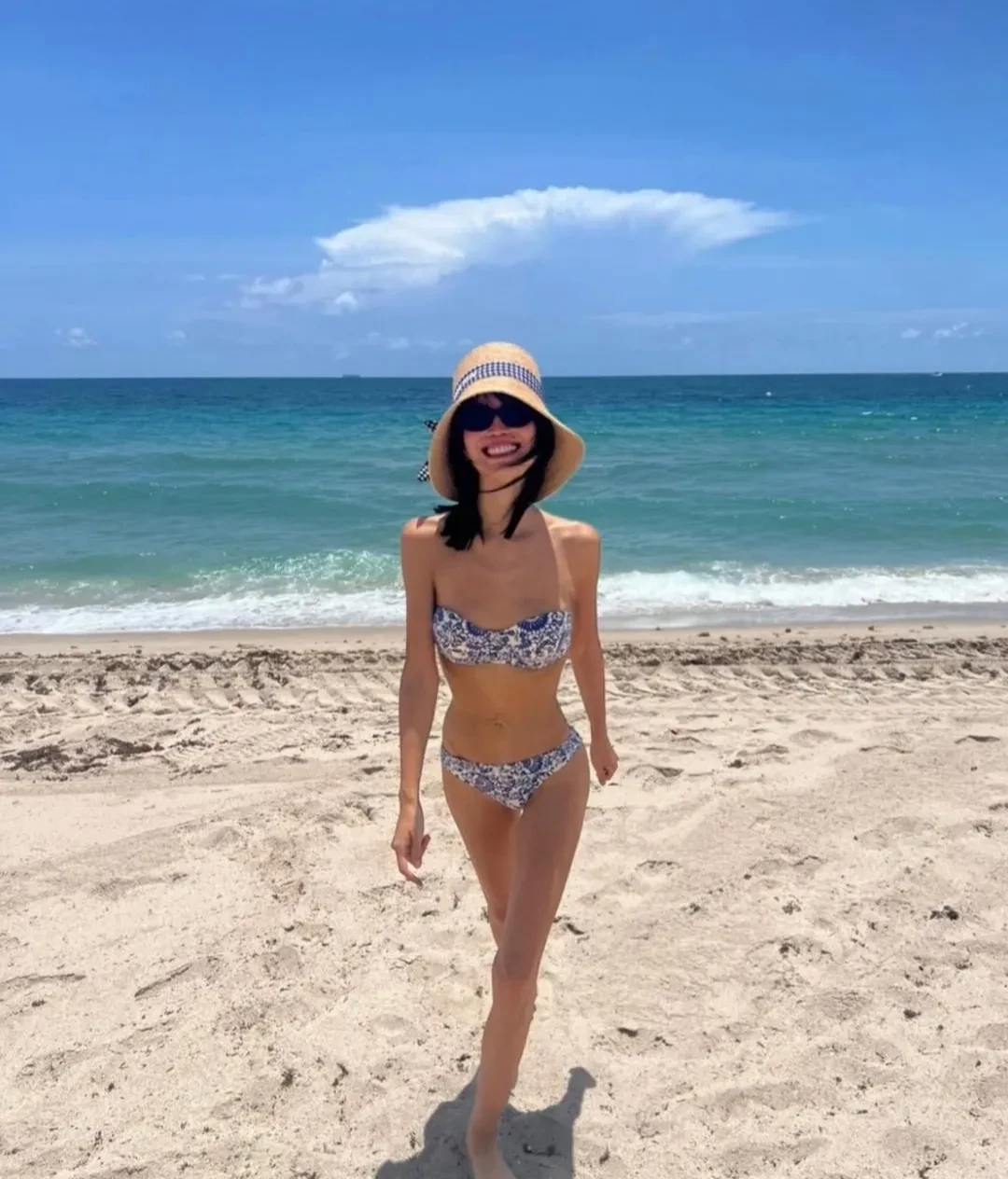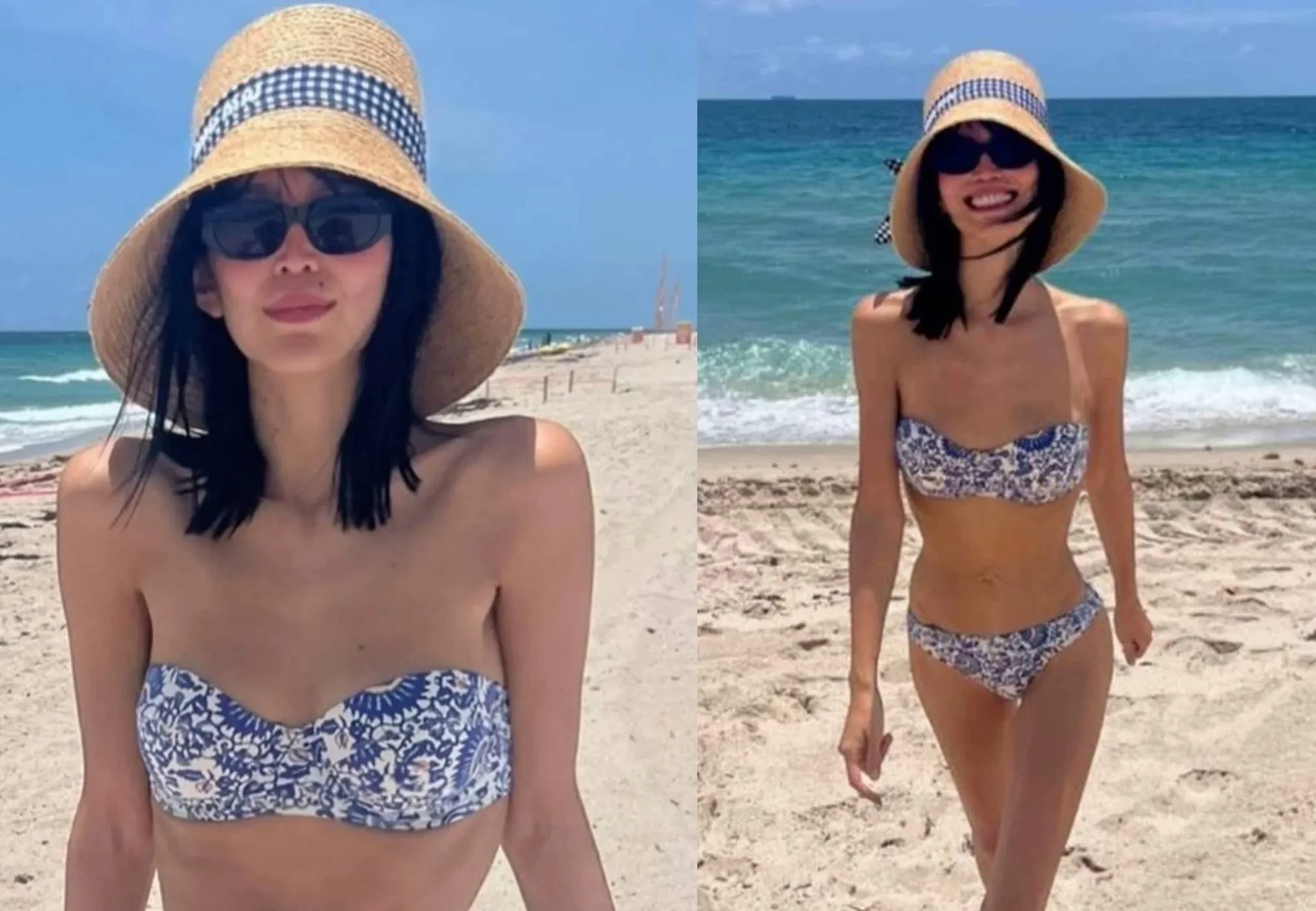 В своих соцсетях девушка опубликовала серию фотографий, снятых на пляже, на которых она предстала в раздельном купальнике, соломенной шляпе и солнцезащитных очках.