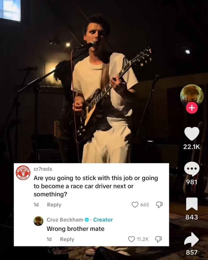 20-летний Круз Бекхэм пошутил над своим старшим братом Бруклином на фоне ссоры с родителями. В своём тиктоке он опубликовал видео со своей песней. Один из подписчиков спросил, останется ли Круз в музыке или станет гонщиком. На что младший Бекхэм ответил: "Это не тот брат, приятель", таким образом намекая на Бруклина, который в разное время был фотографом, моделью, поваром, производителем соусов и гонщиком.