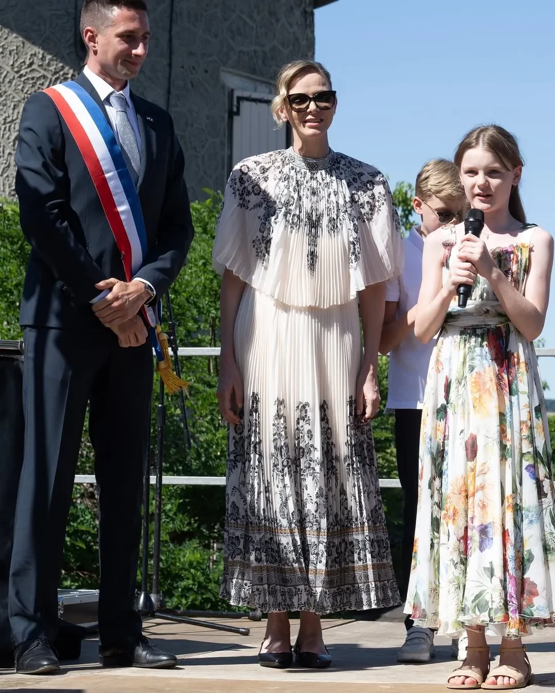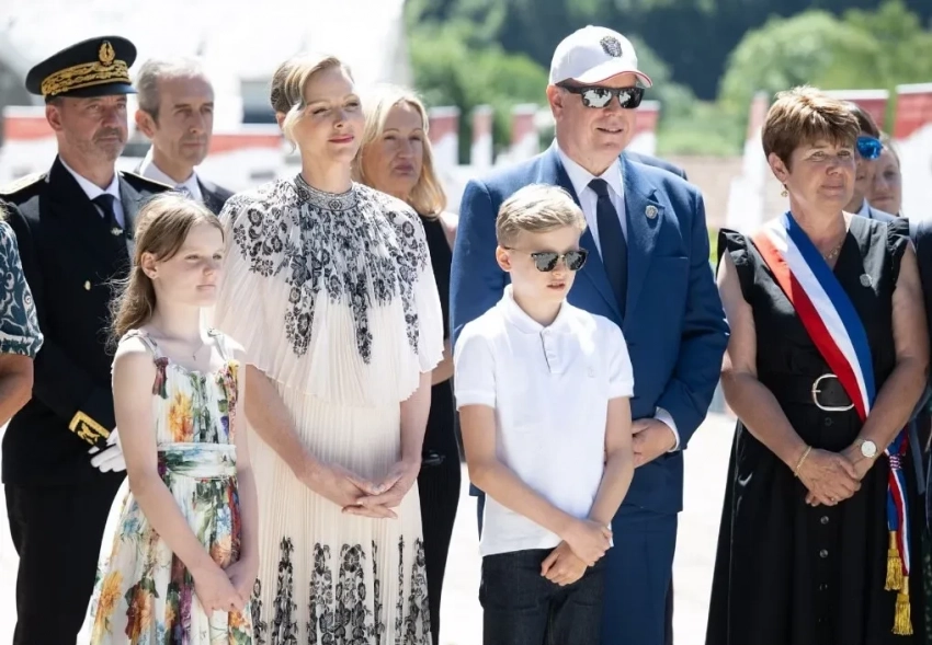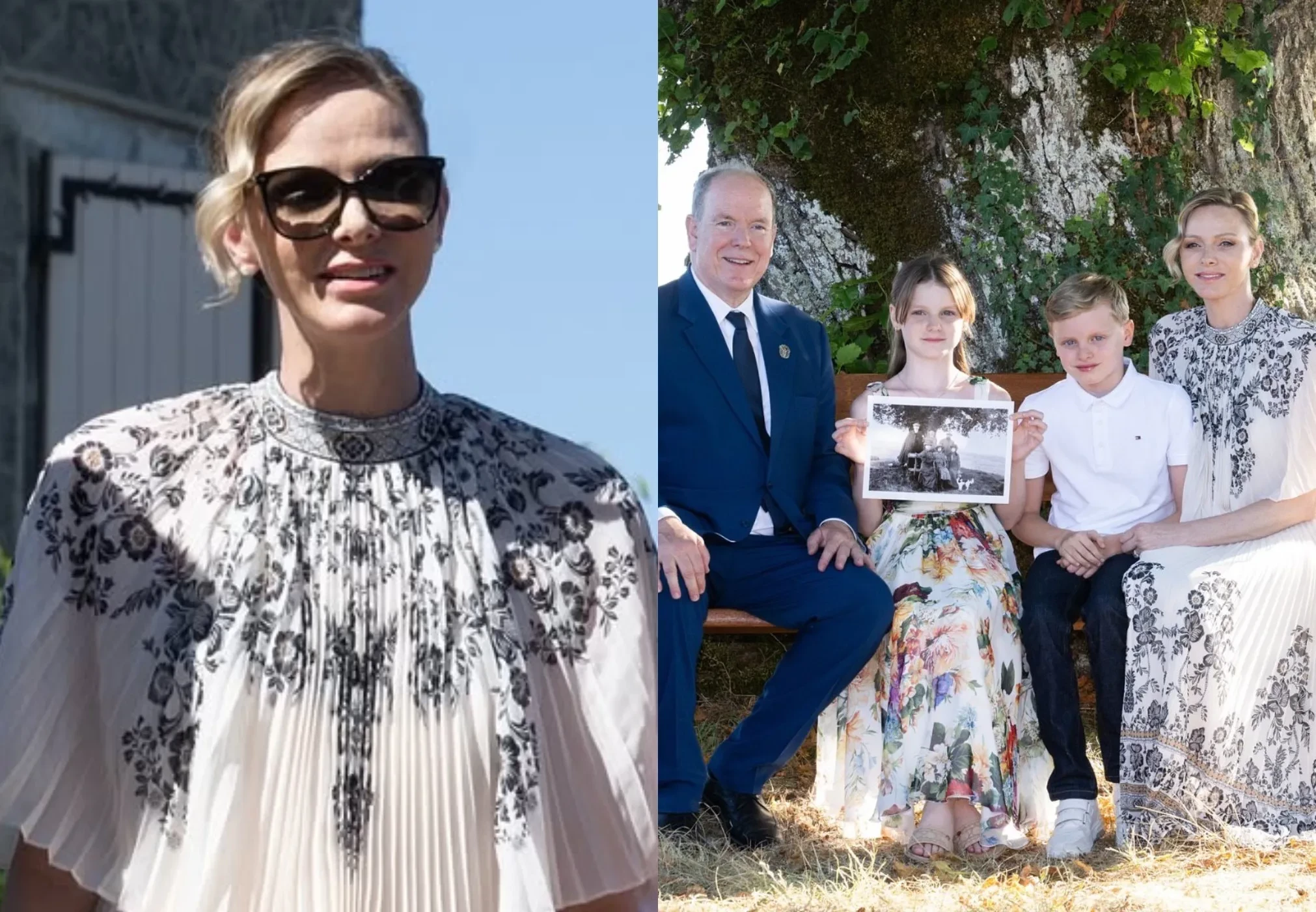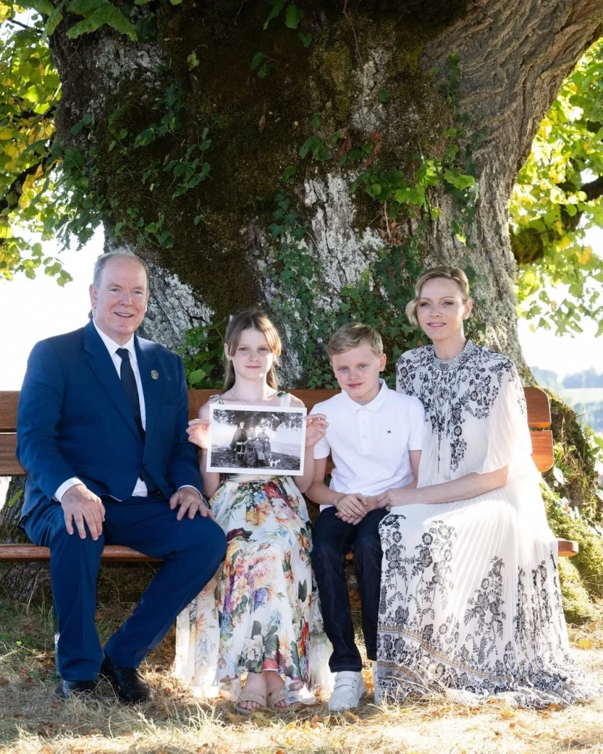 47-летняя Шарлен позировала в белом плиссированном платье с узором, дополнив образ солнцезащитными очками, а Габриэлла надела платье с цветочным принтом. 67-летний Альбер позировал в классическом синем костюме, а Жак — в белом поло и очках Ray Ban.
