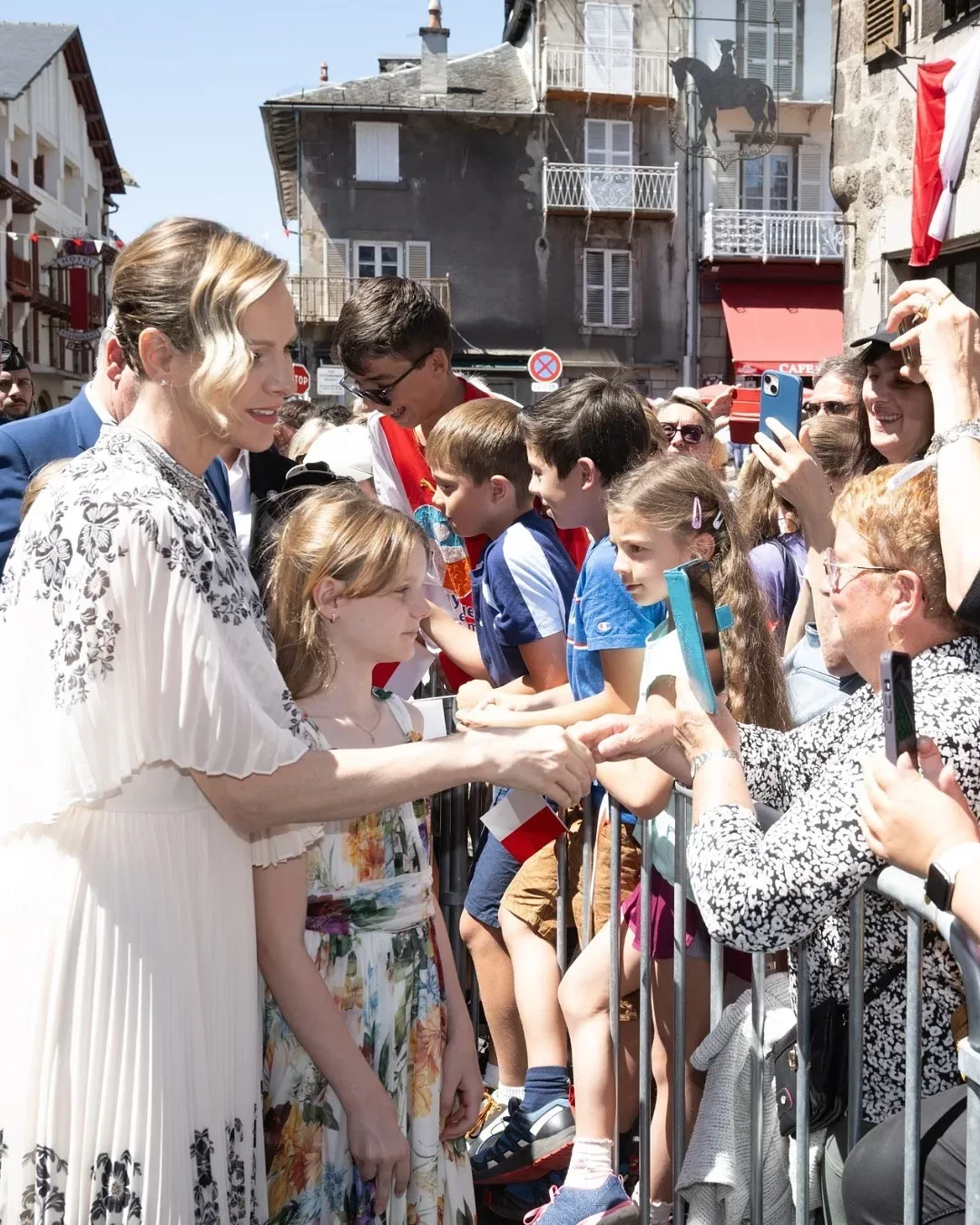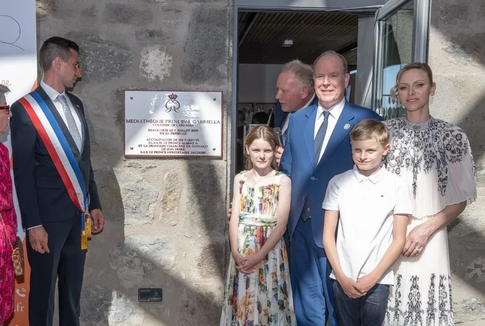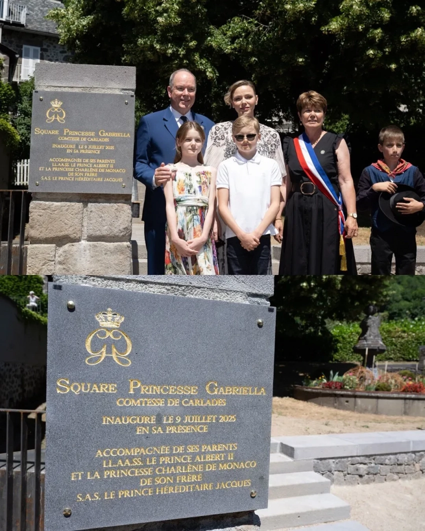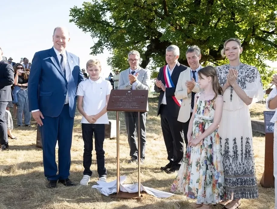 Княгиня Шарлен и принцесса ГабриэллаПосле этого монархи отправились в коммуну Мюр-де-Баррес, где принцесса Габриэлла вместе со своими родителями и братом открыла медиатеку своего имени, а в деревне Канталь в честь принцессы открыли ботанический сад. Шарлен и Альбер сделали семейное фото с детьми возле дерева, под которым в 1912 году была сфотографирована бабушка князя, принцесса Шарлотта. Габриэлла запечатлена с этим фото в руках.