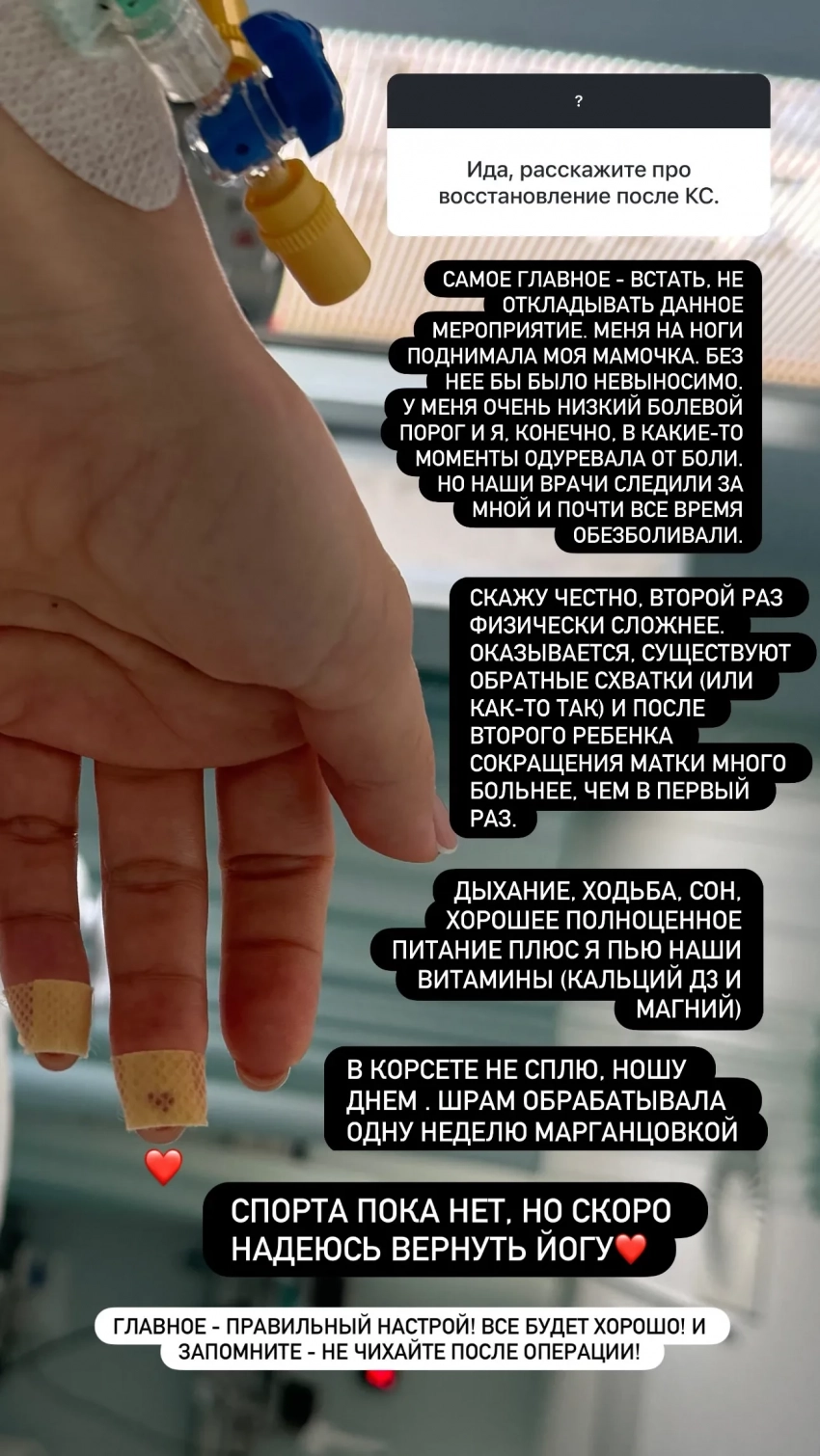 В своём инстаграме* 35-летняя блогерша ответила на вопросы подписчиков о самочувствии после кесарева сечения. "Меня на ноги поднимала моя мамочка, без неё было бы невыносимо. У меня очень низкий болевой порог, и, конечно, в какие-то моменты одуревала от боли, но наши врачи следили за мной и почти всё время обезболивали. Скажу честно, второй раз физически сложнее. Оказывается, существуют обратные схватки, и после второго ребёнка сокращение матки намного больнее, чем в первый раз. Важны дыхание, ходьба, сон, хорошее полноценное питание, плюс я пью витамины".