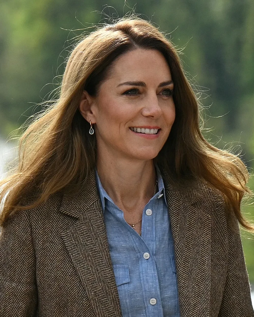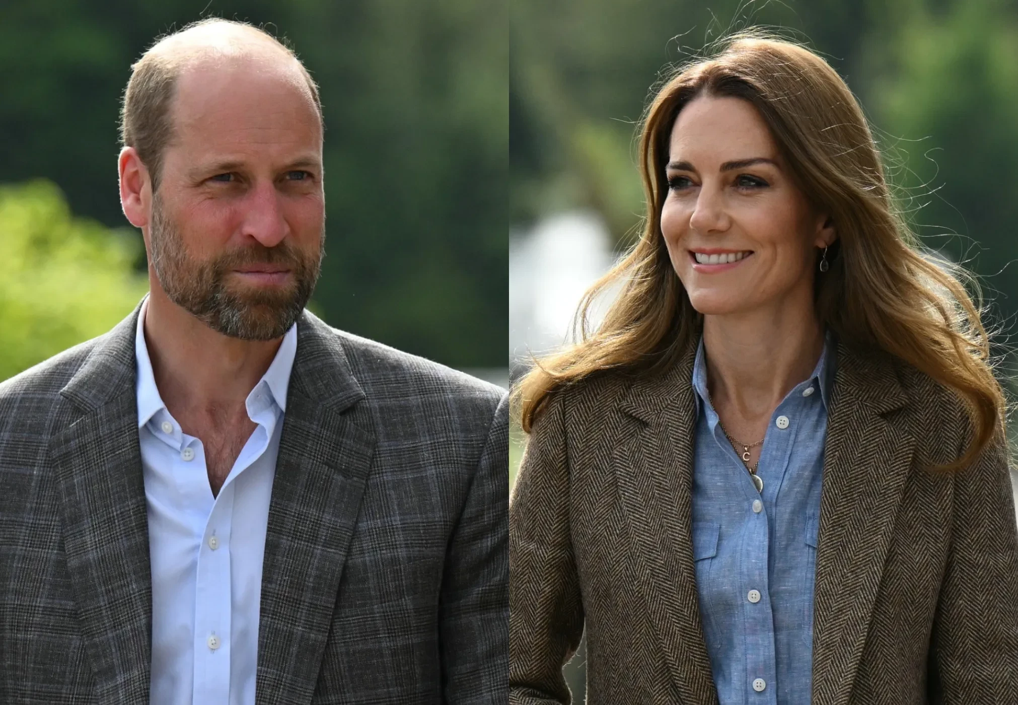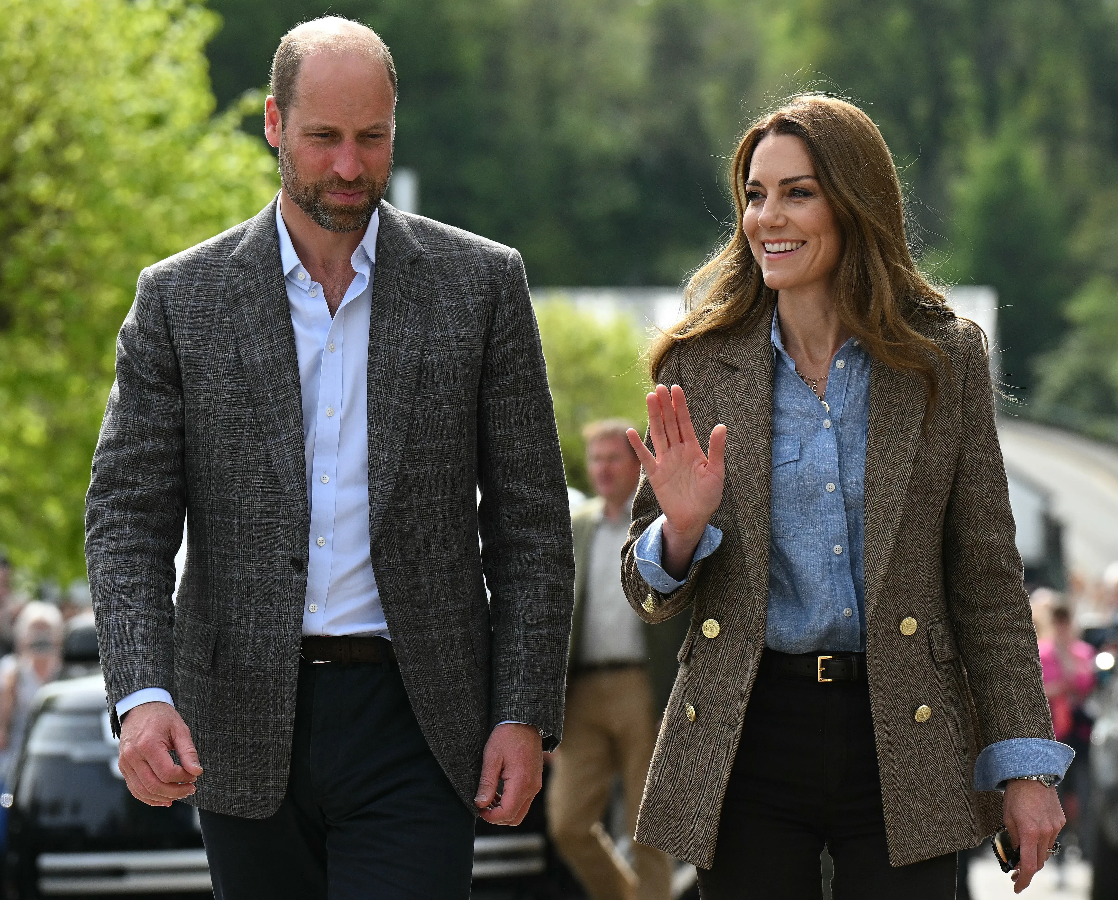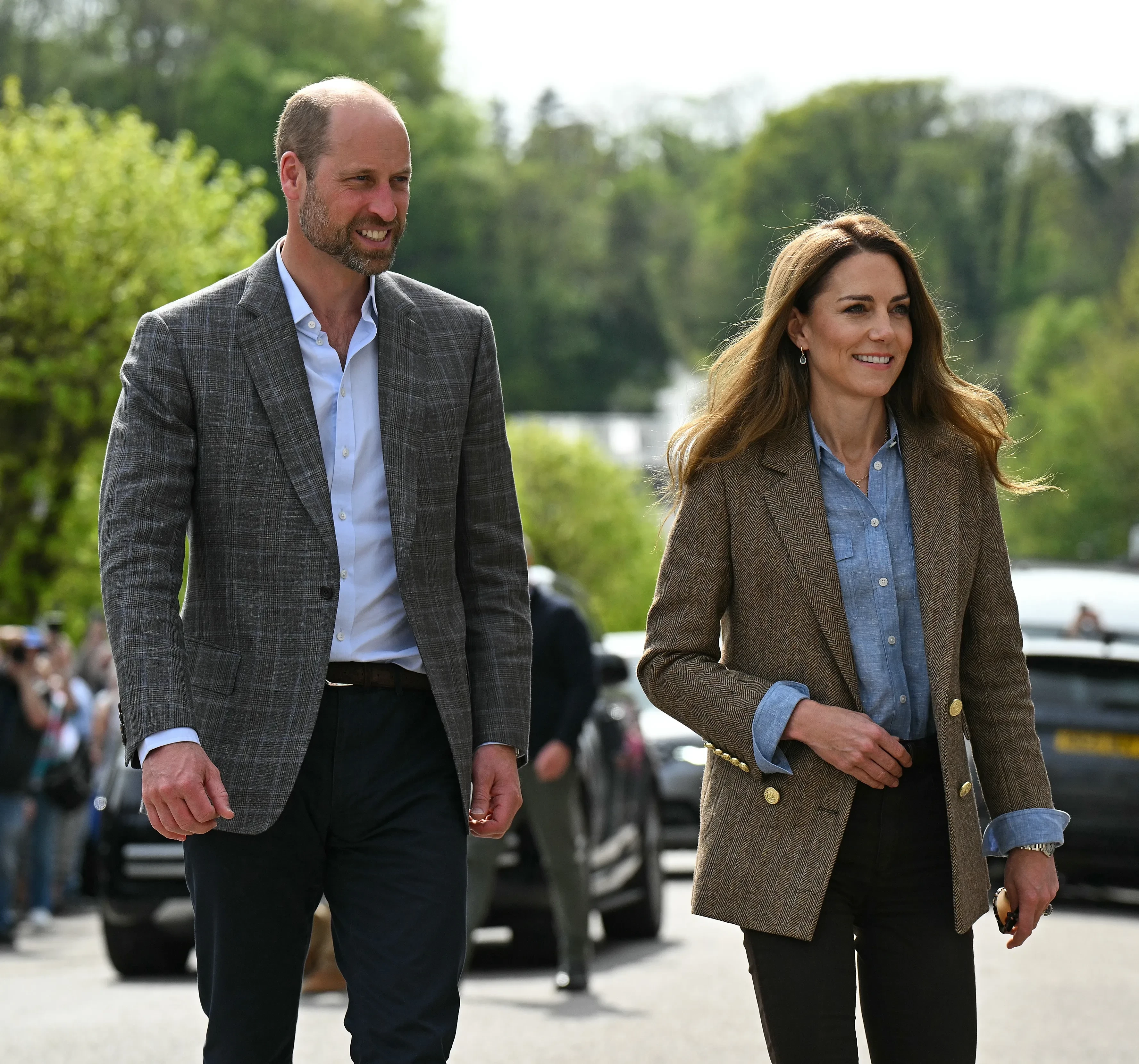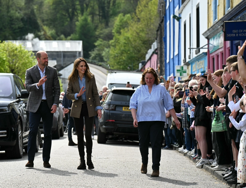 43-летняя Кейт Миддлтон, которая в прошлом году прошла курс лечения от рака, появилась перед жителями острова в жакете и голубой рубашке, которые она надела с джинсами скинни и грубыми ботинками. 42-летний наследник британского престола выбрал похожий образ: пиджак в клетку и голубую рубашку.