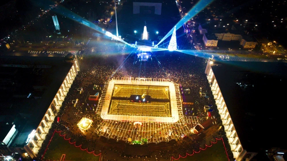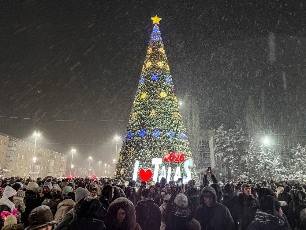 В Таласе новогодняя елка была торжественно открыта вместе с отреставрированной центральной площадью, и выпавший снег добавил волшебства к этому событию.Ошская новогодняя красавица