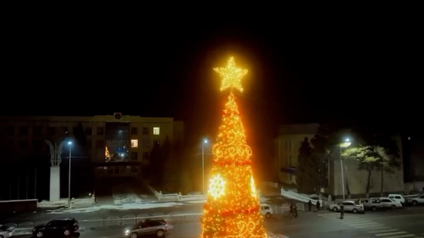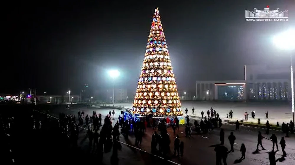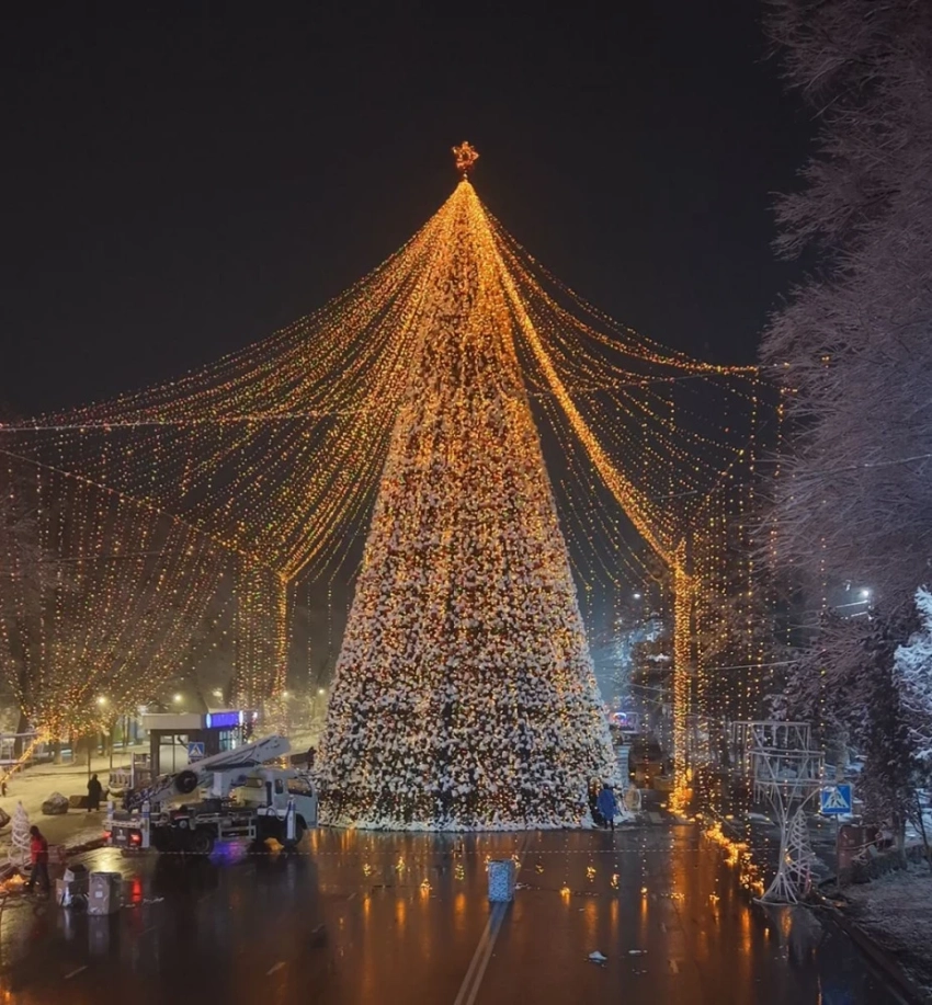 В Токмоке также установлена новогодняя елка, которая украшена длинными гирляндами, создающими атмосферу праздника.