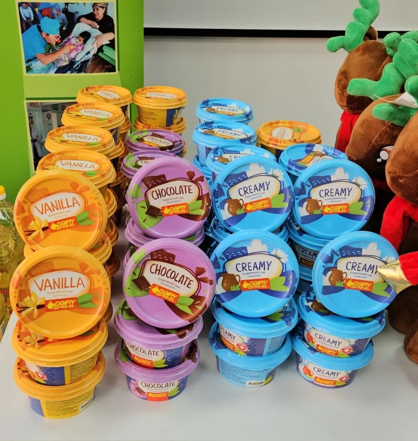 В рамках благотворительной акции каждому ребенку была вручена мягкая игрушка, символизирующая наступающий год, а также переданы масложировая продукция от компании «Шедевр» и сыры от «Сут-Булак», многолетних партнеров фонда.