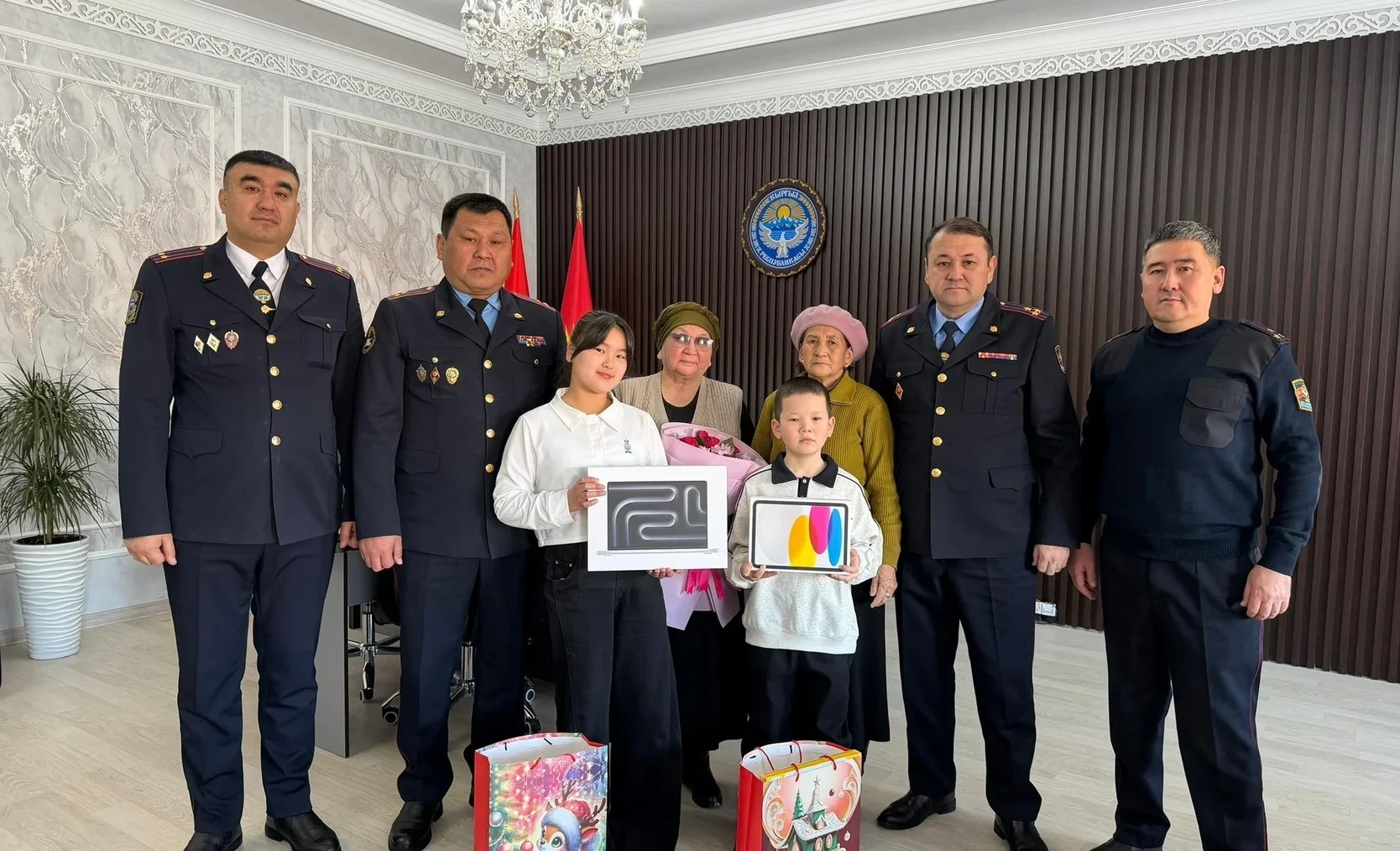 Кроме того, с юными посетителями и их бабушками пообщался начальник Следственной службы МВД Кыргызской Республики Мирлан Насиров. От имени министра внутренних дел ребята получили ценные подарки, среди которых были планшет iPad, ноутбук MacBook Air 15 и различные сладости.