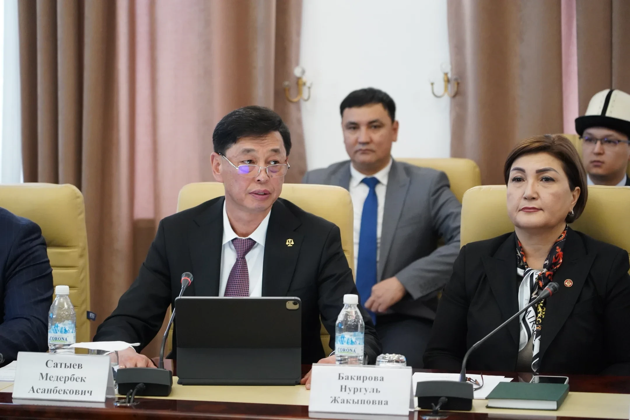 Участие в мероприятии приняли такие ключевые фигуры, как председатель Верховного суда Медербек Сатыев, его заместитель Нургуль Бакирова, а также ряд других высокопоставленных представителей судебной системы, включая советника председателя Руслана Мырзалимова и директора Высшей школы правосудия Эркина Токтомбетова.
