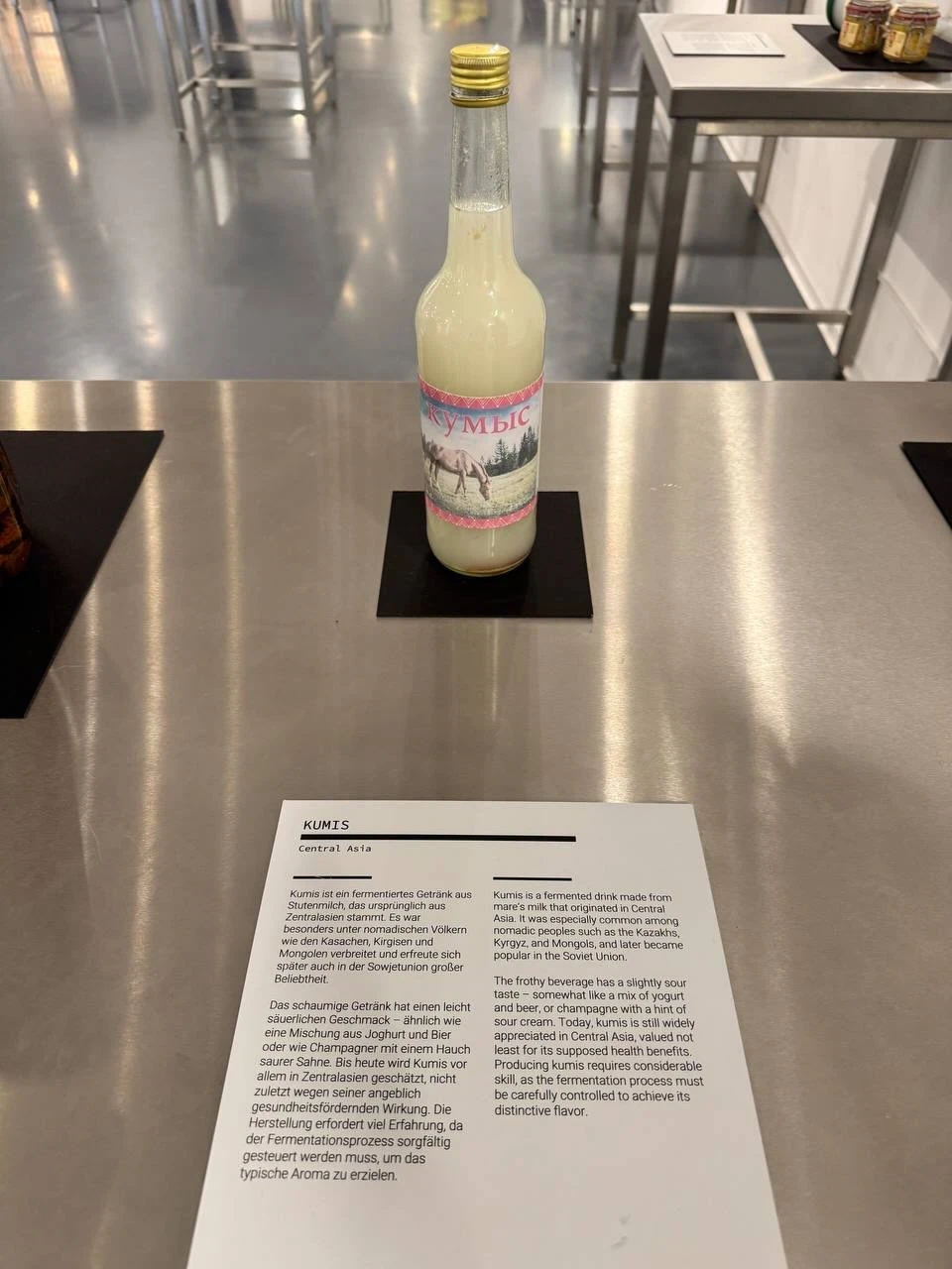 На табличке рядом с экспонатом описано, что кумыс — это ферментированный напиток из кобыльего молока, который возник в Центральной Азии. Он был популярным среди кочевых народов, таких как казахи, кыргызы и монголы, а затем стал известен и в Советском Союзе.