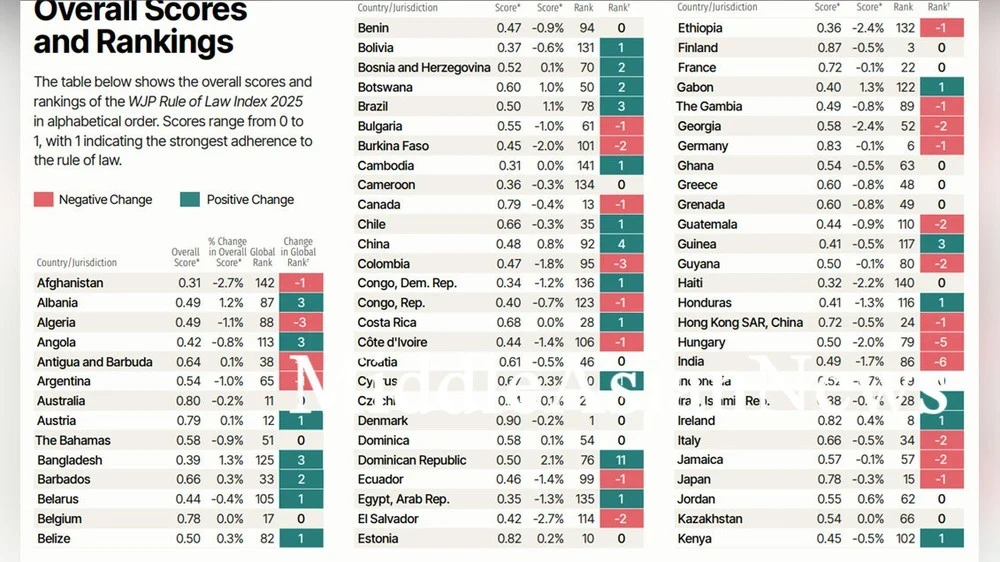 Всемирный проект по справедливости (World Justice Project) недавно обнародовал Индекс верховенства права за 2025 год, который охватывает 143 страны. Основанный на опросах граждан и мнениях экспертов, рейтинг учитывает восемь основных критериев, включая ограничения государственной власти и эффективность правосудия в гражданских и уголовных делах. Каждой стране присваивается балл в диапазоне от 0 до 1, где 1 обозначает полное соблюдение принципов верховенства закона, а 0 — их отсутствие.